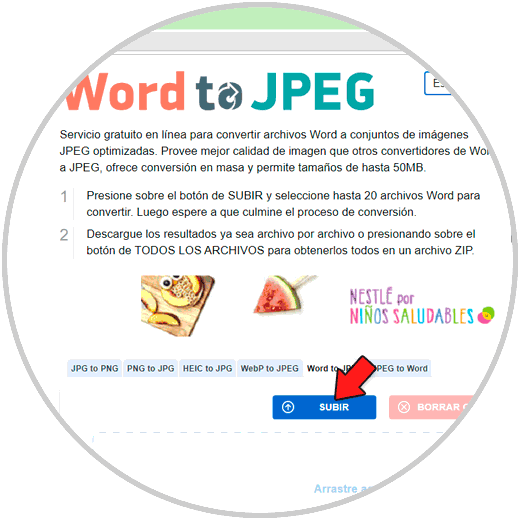 Esta es otra de las opciones a usar, esta vez con la web wordtojpeg, vamos al siguiente enlace. Damos clic en "Subir"
