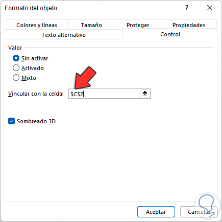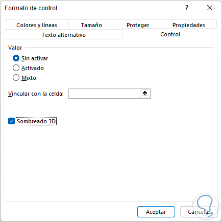 Damos clic derecho sobre la casilla de verificación y seleccionamos "Formato de control":