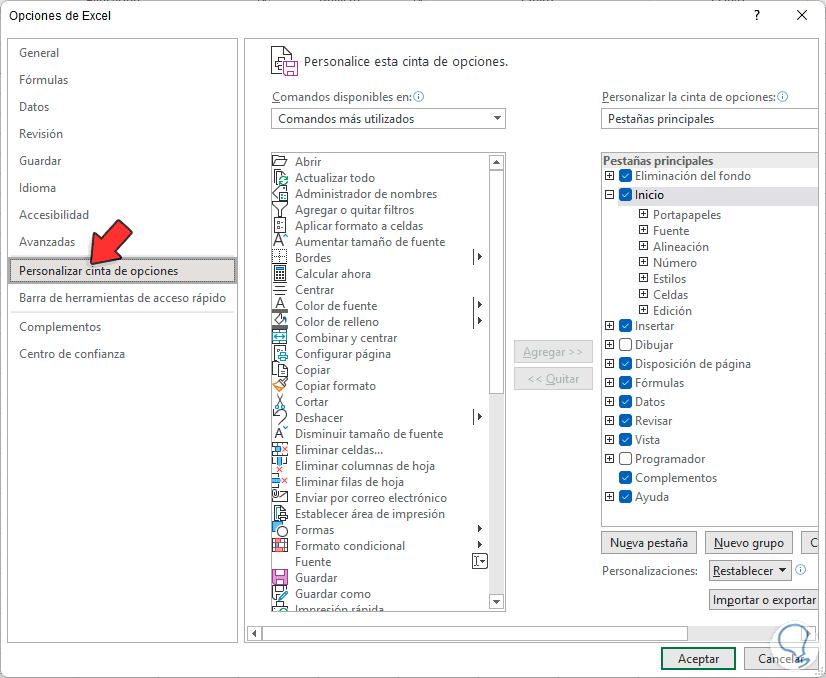 En la ventana emergente vamos a la sección "Personalizar cinta de opciones" donde veremos lo siguiente: