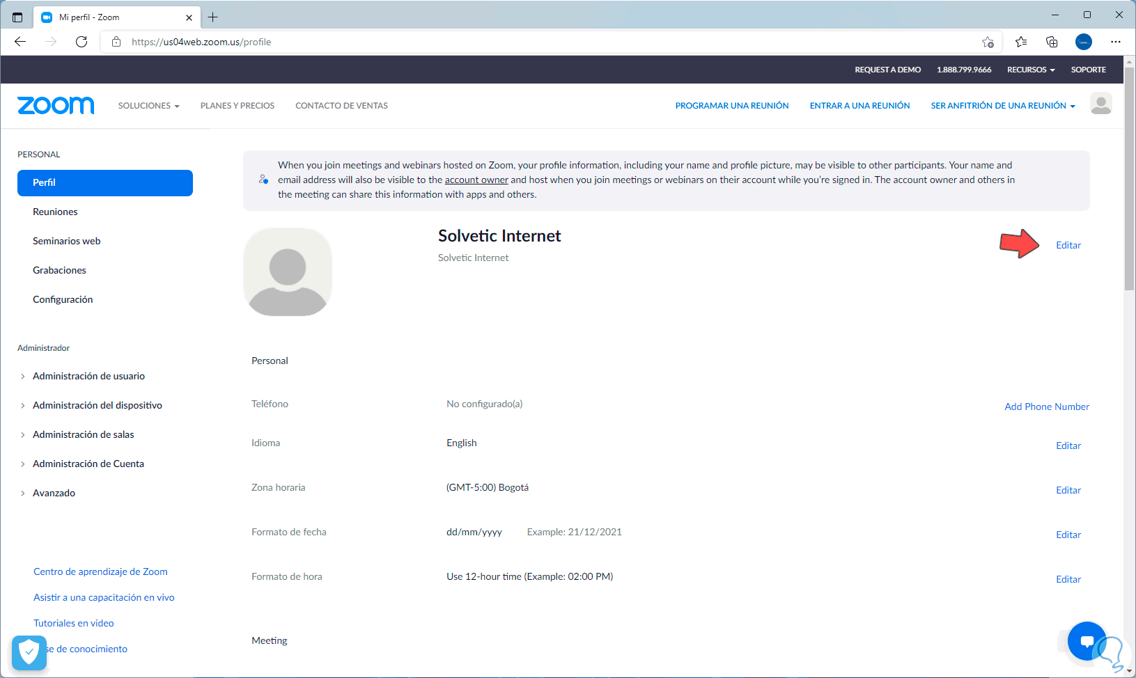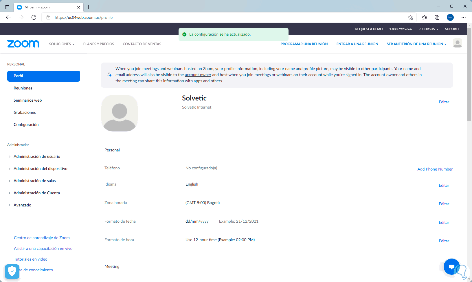 Iniciamos sesión en Zoom y automáticamente seremos redireccionados a la página de gestión de la cuenta, vamos a la sección "Perfil" donde veremos lo siguiente: