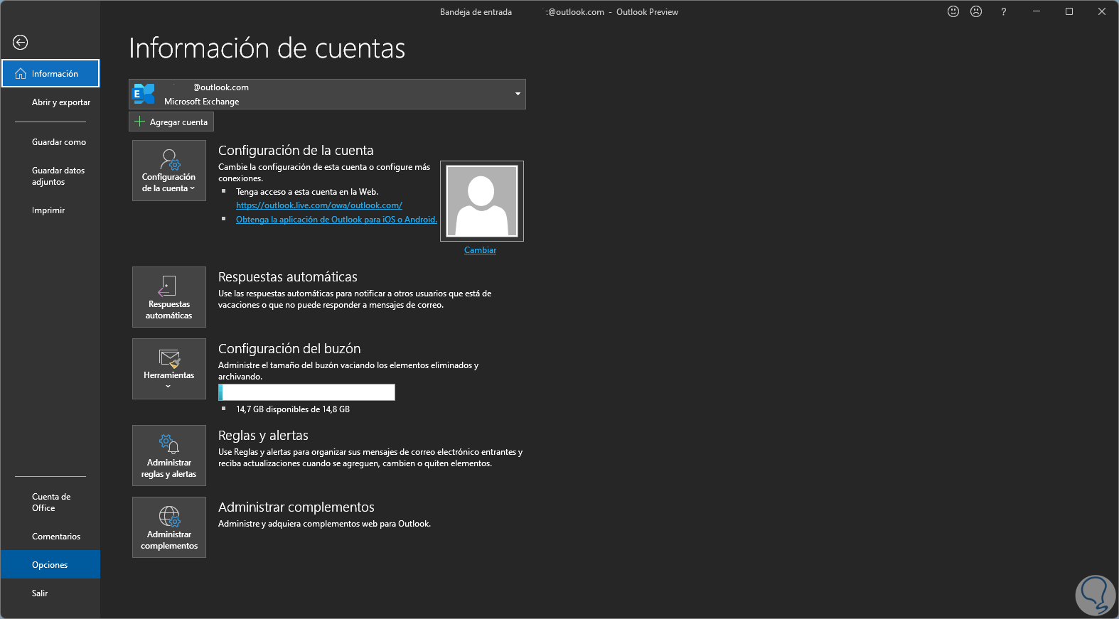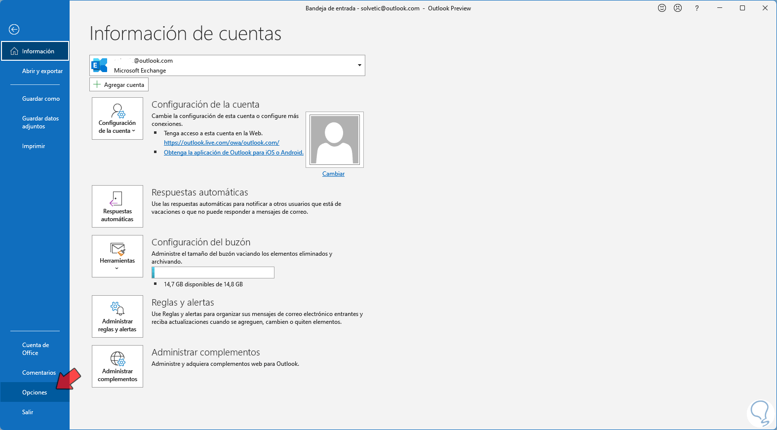 Abrimos Outlook e iremos a "Archivo - Opciones":