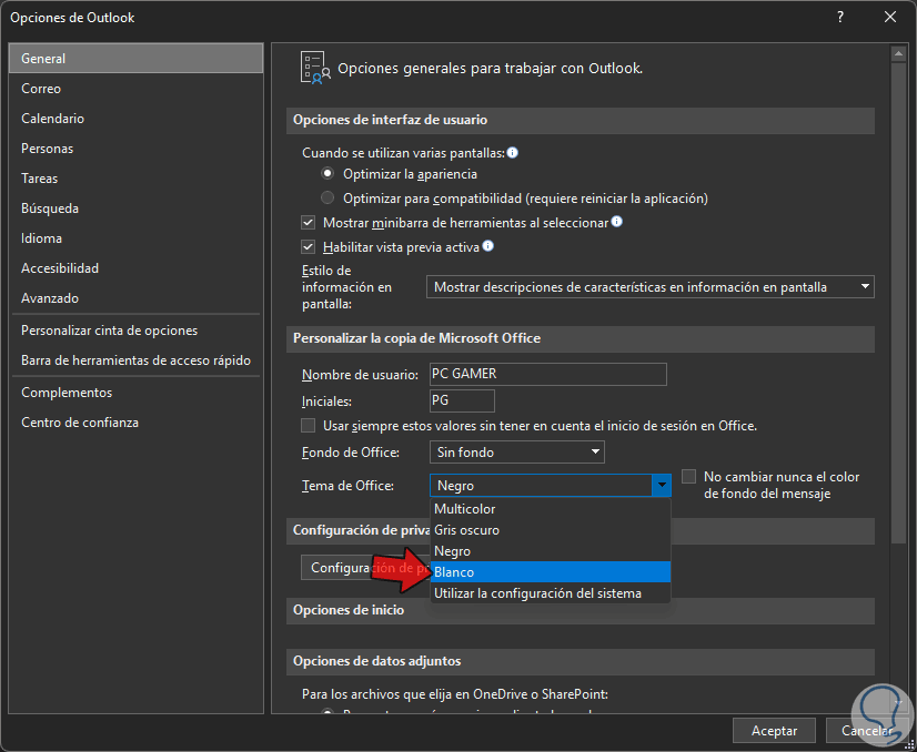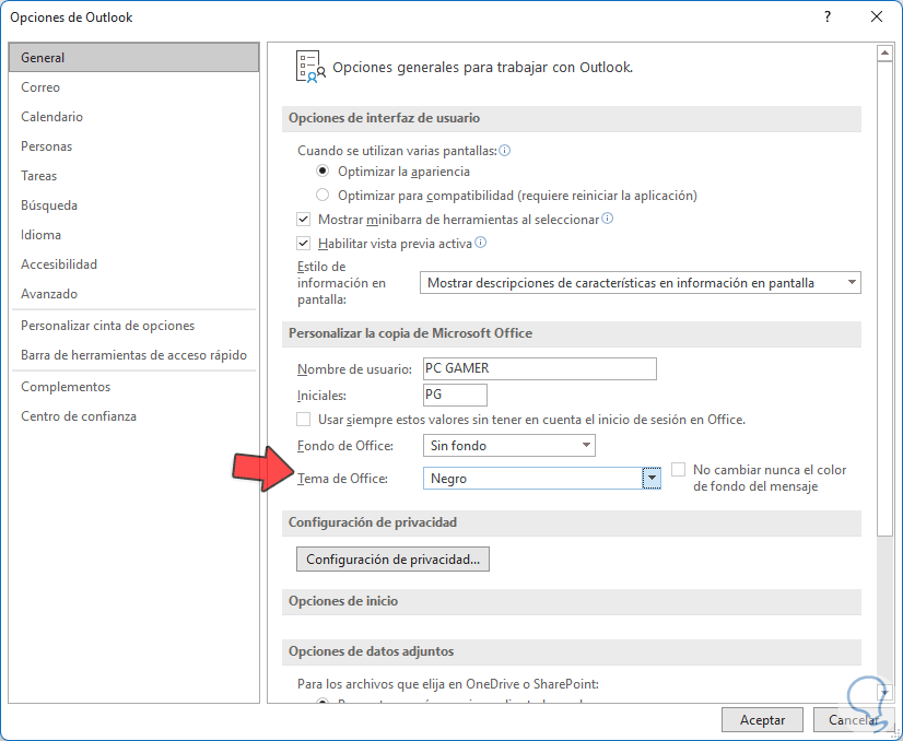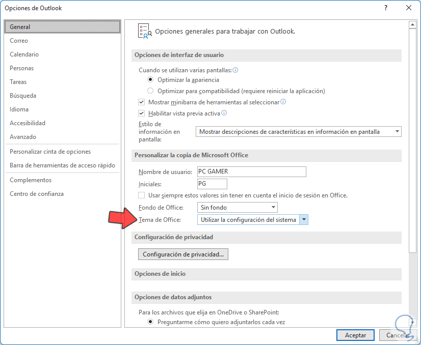 En la ventana emergente, en "General" vamos a la sección "Tema de Office":