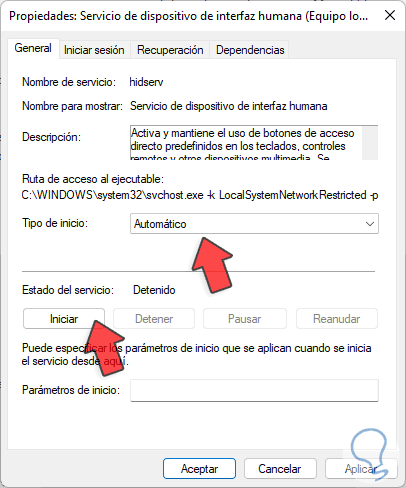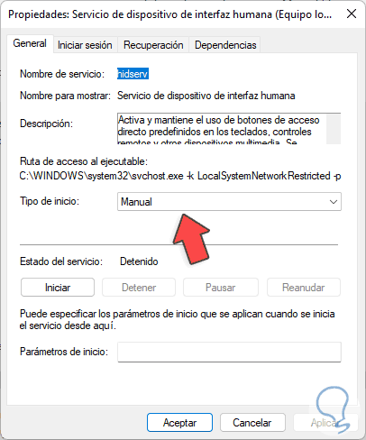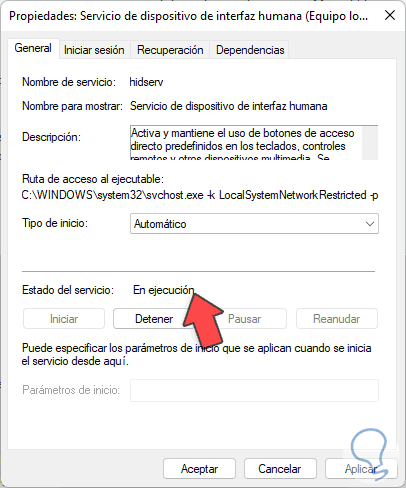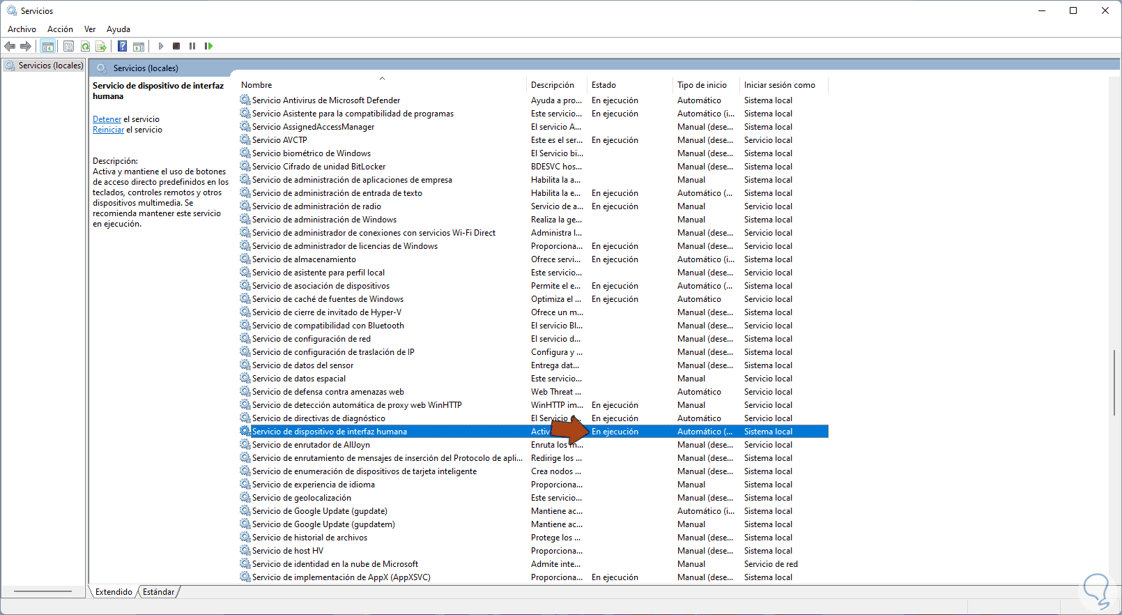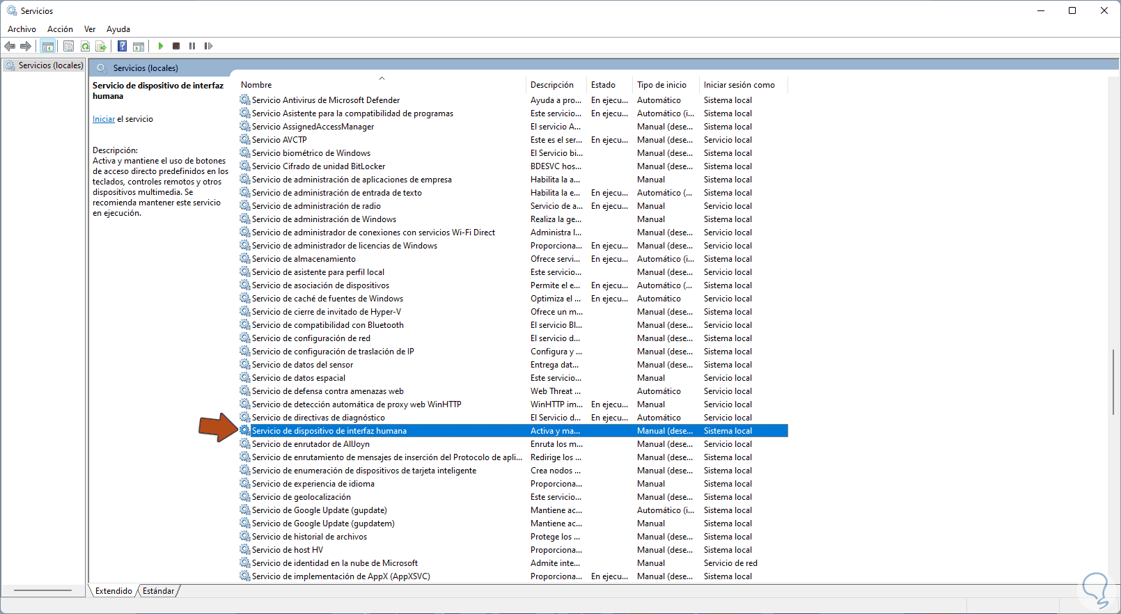Ubicamos el servicio "Servicio de dispositivo de interfaz humana":