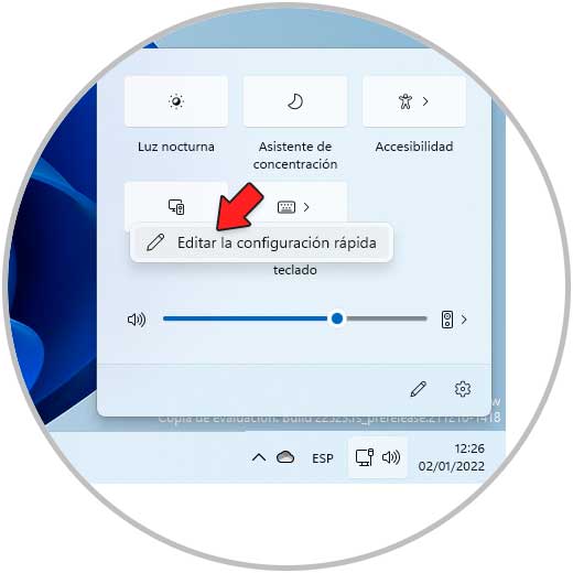 Para eliminarlo, damos clic en el icono de red y volumen en la barra de tareas, damos clic derecho y seleccionamos "Editar la configuración rápida";