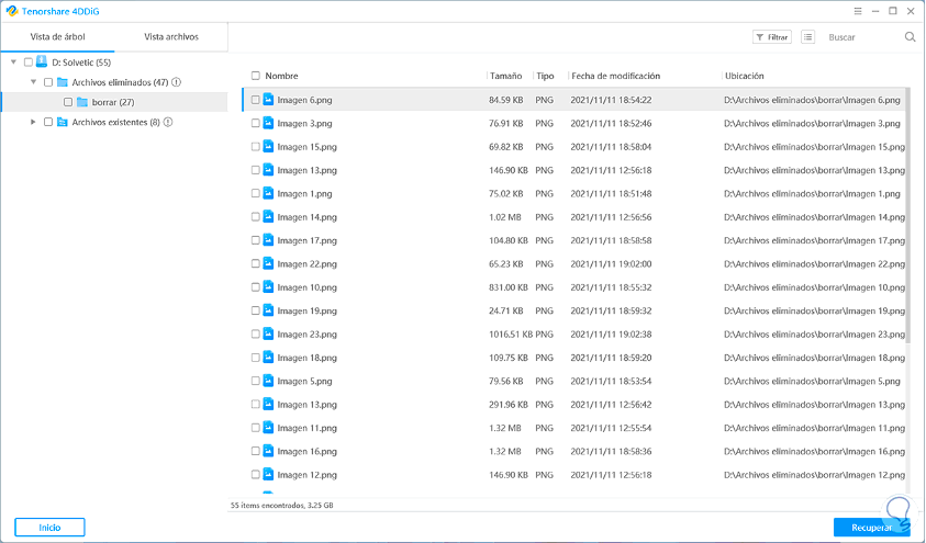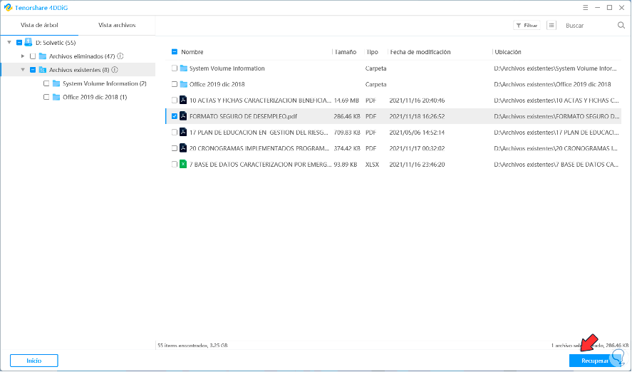 Seleccionamos los archivos que queremos recuperar y damos clic en “Recuperar”.