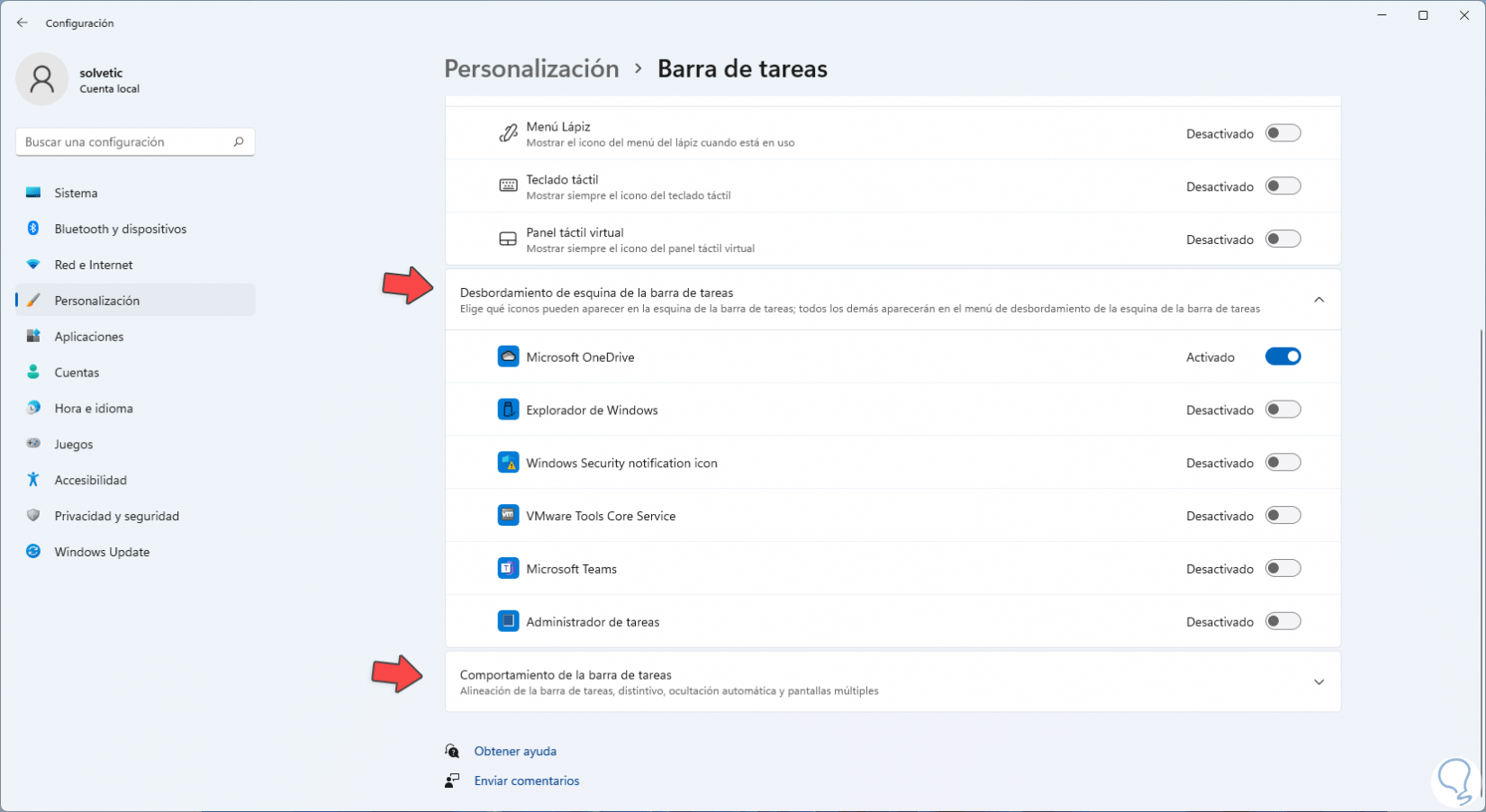 En la sección “Desbordamiento de esquina de la barra de tareas” es posible activar que aplicaciones estarán allí alojadas. Pulsamos también en “Comportamiento de la barra de tareas”