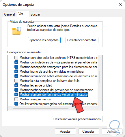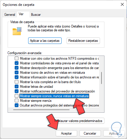 En el menú Ver ubicamos la casilla "Mostrar siempre iconos, nunca vistas en miniatura":