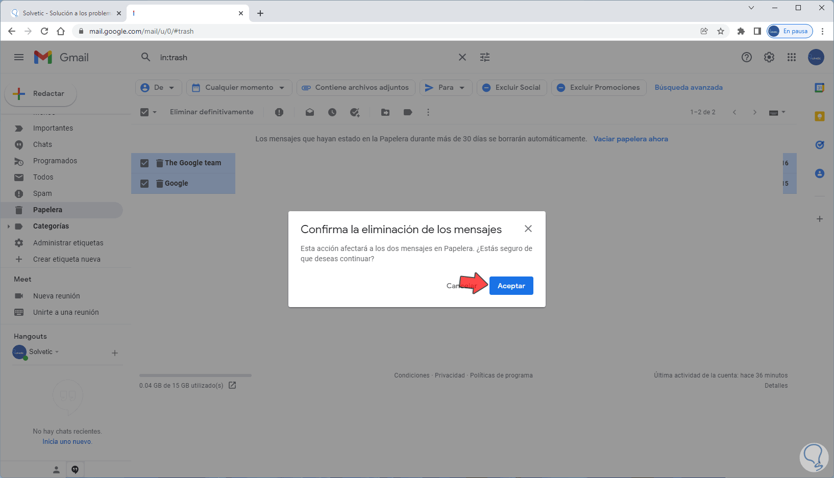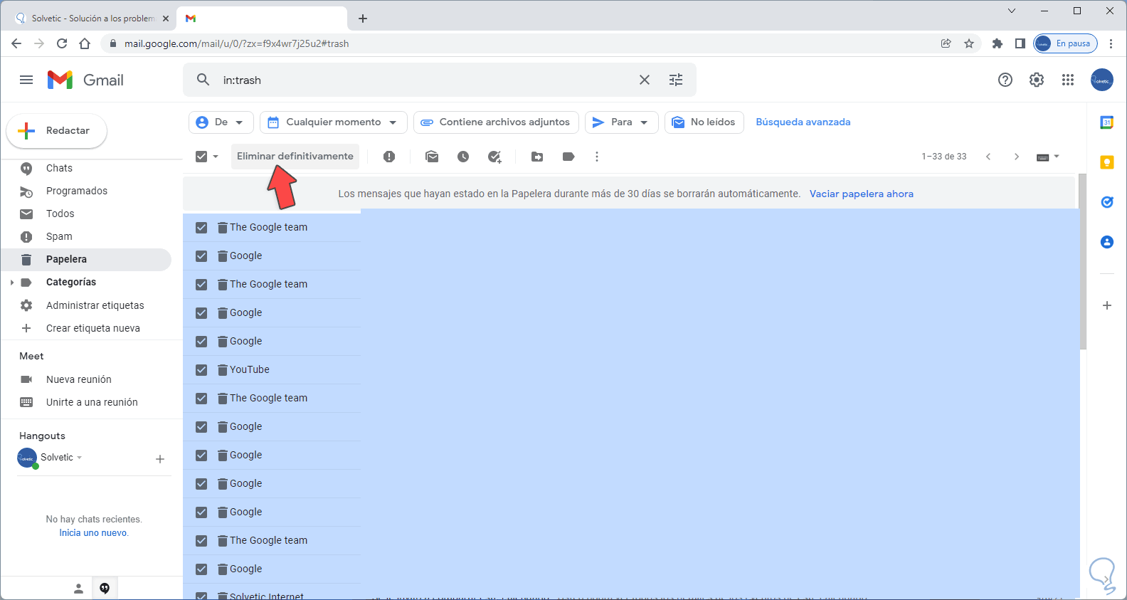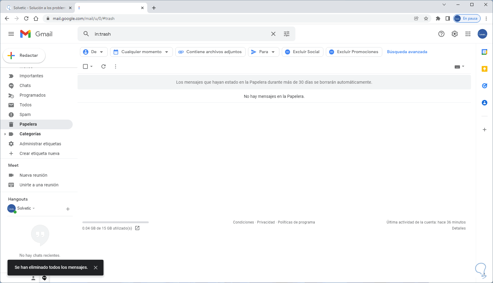 Vemos que todos los mensajes serán borrados de la papelera en Gmail: