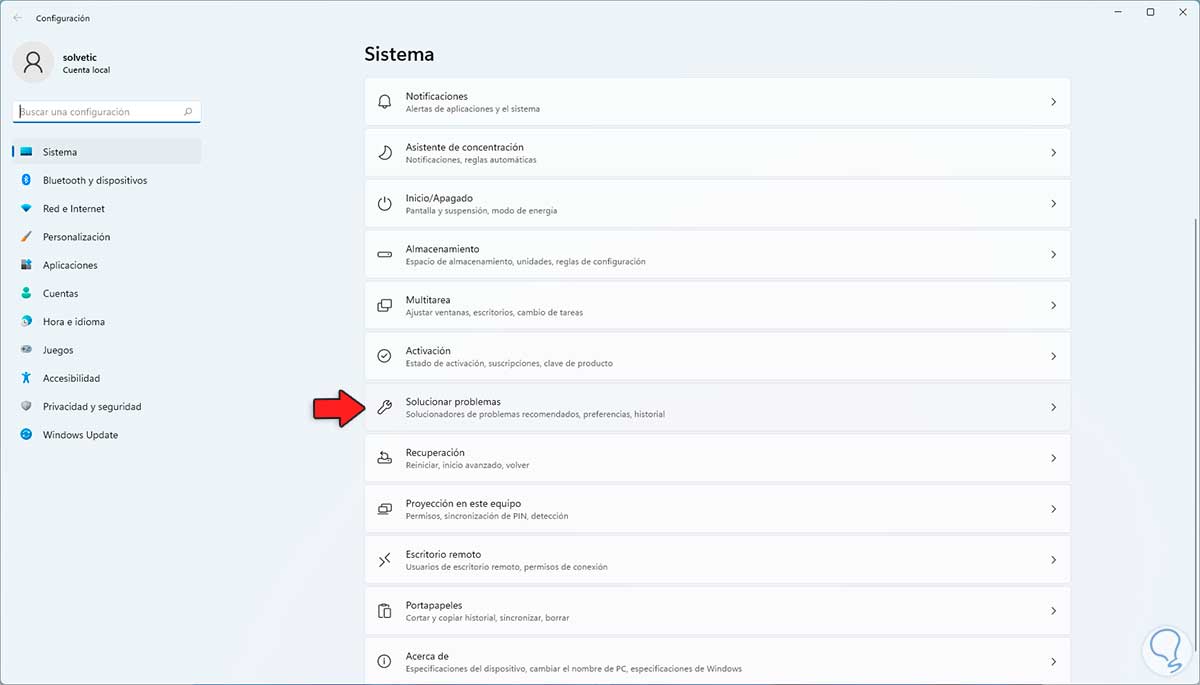 Luego iremos a “Sistema - Solucionar problemas”: