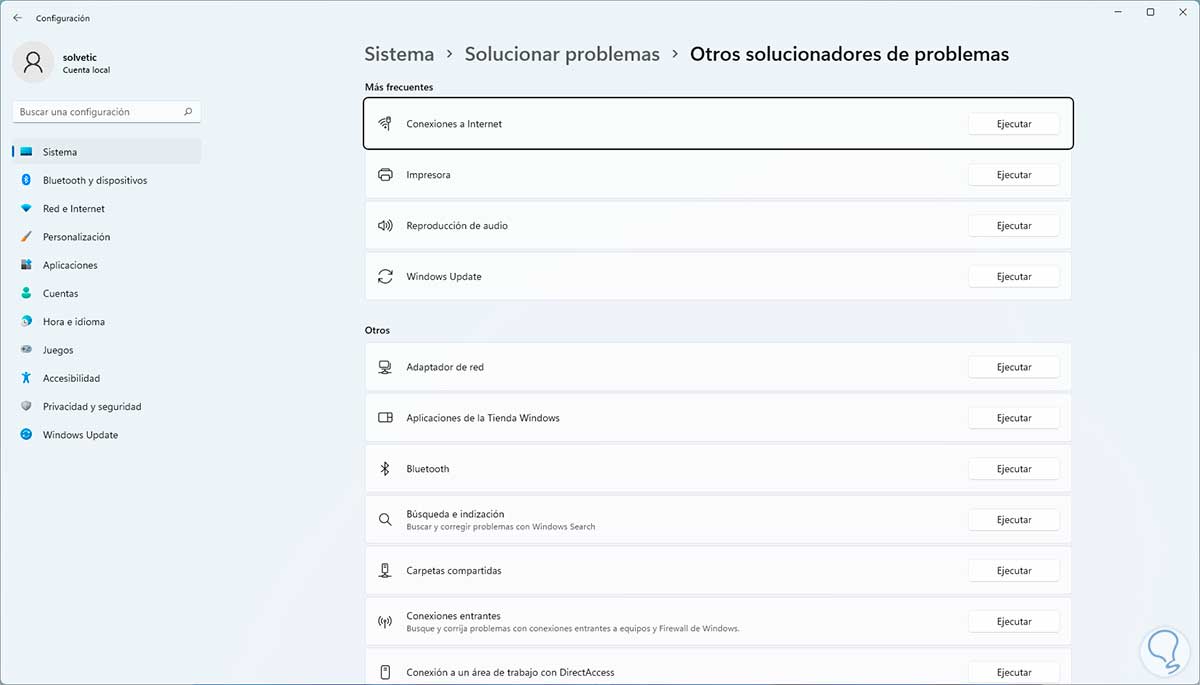 Damos clic en "Otros solucionadores de problemas" para acceder a las diversas opciones disponibles.