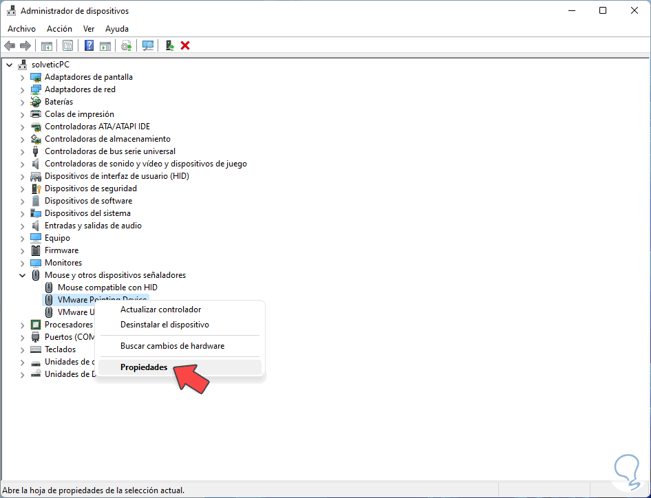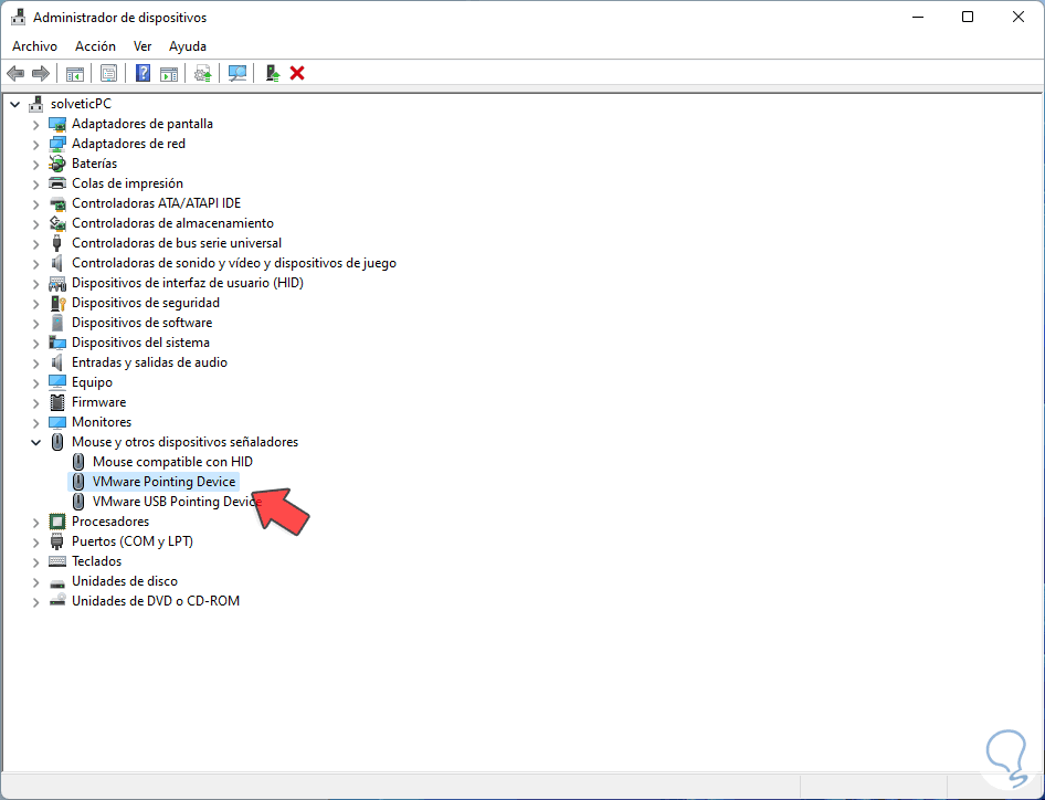 Expande la sección "Mouse y otros dispositivos señaladores" y selecciona el controlador con la leyenda "Pointing Device":