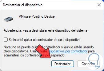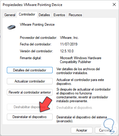 En la ventana emergente vamos a la pestaña "Controlador" y allí damos clic en "Desinstalar el dispositivo":