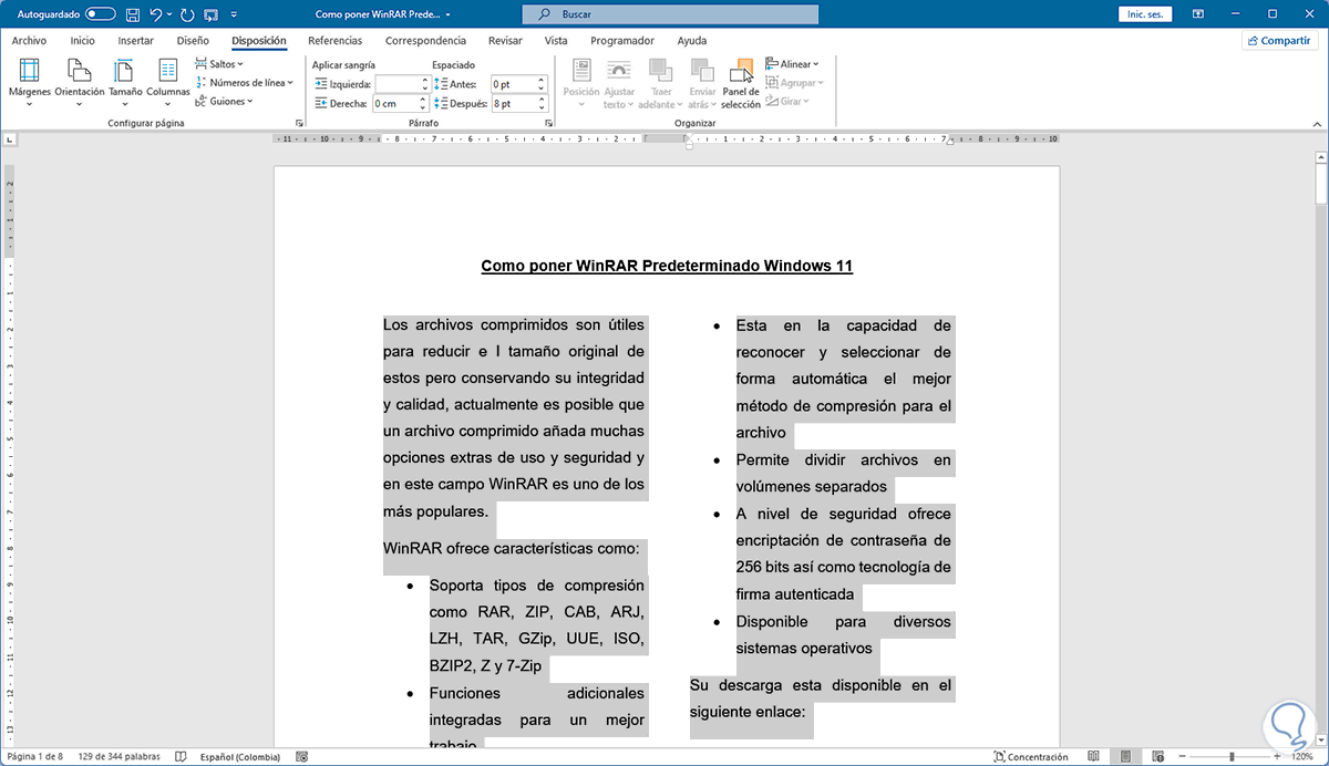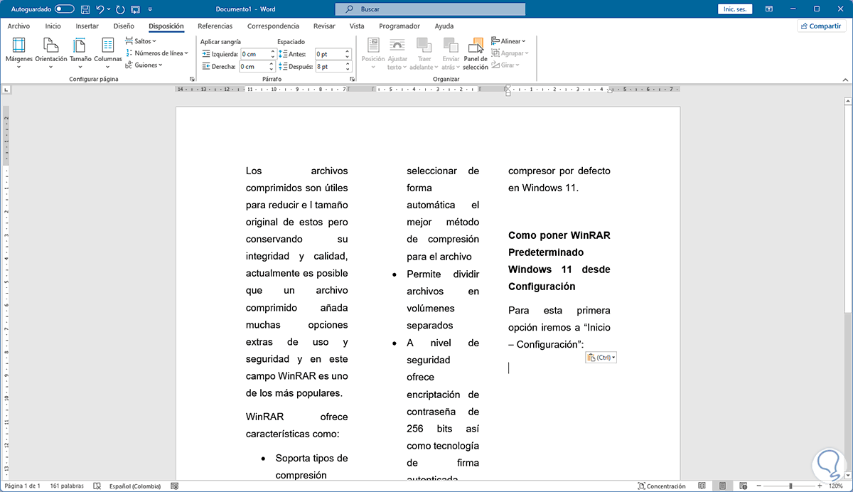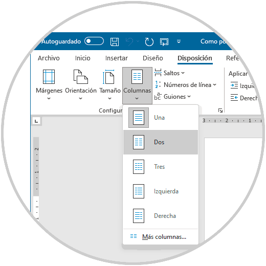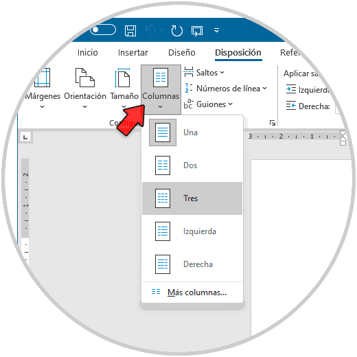 Vamos al menú "Disposición" y en "Columnas" definimos la cantidad de columnas a usar: