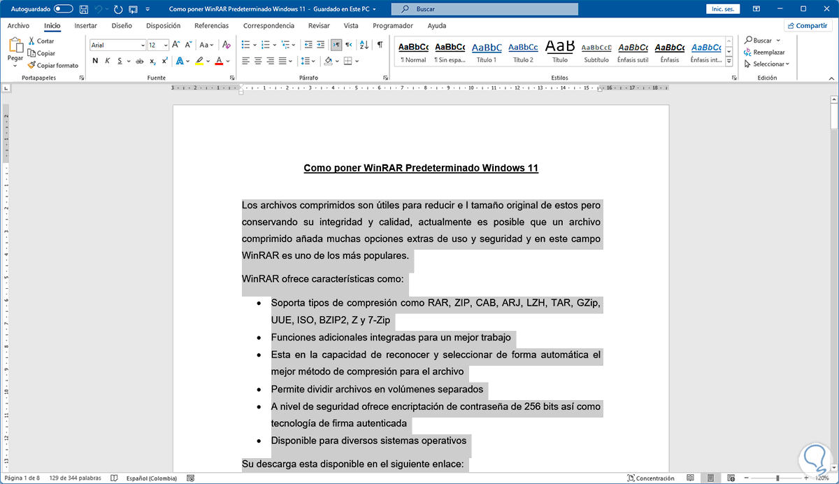 Ahora, es posible añadir columna un documento ya creado, abrimos el documento existente, seleccionamos el texto a usar en columnas:
