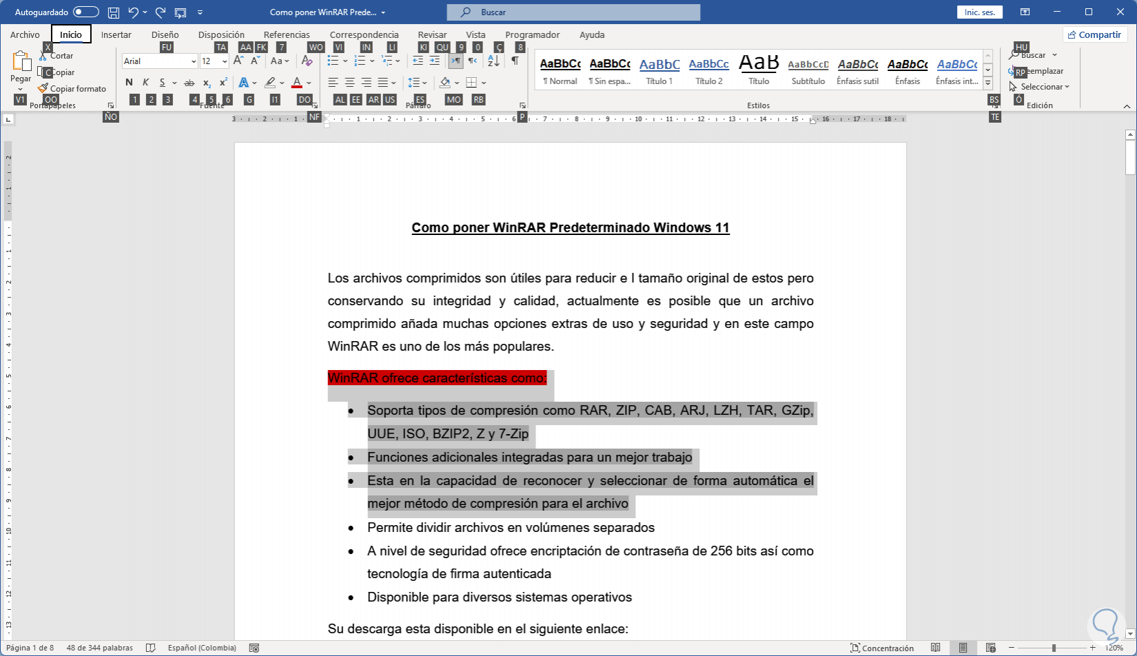 En este caso seleccionamos el texto resaltado y usamos la secuencia de teclas siguientes, se abrirá los menús en cada sección del documento: