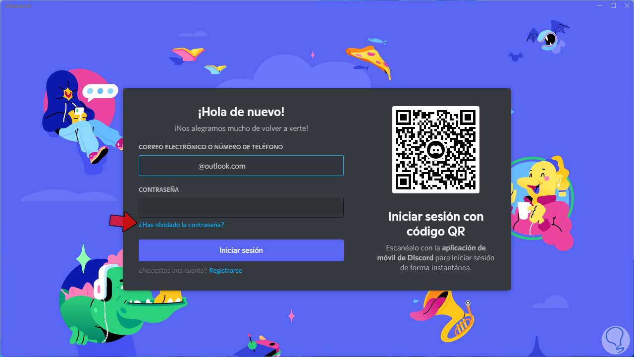 En la aplicación, ingresamos el correo asociado a Discord. Damos clic en "¿Has olvidado la contraseña"