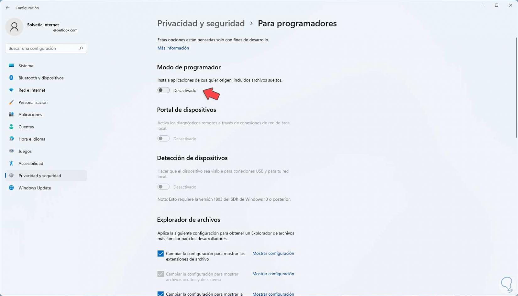 Activamos el interruptor "Modo de programador" y se abrirá la siguiente ventana emergente: