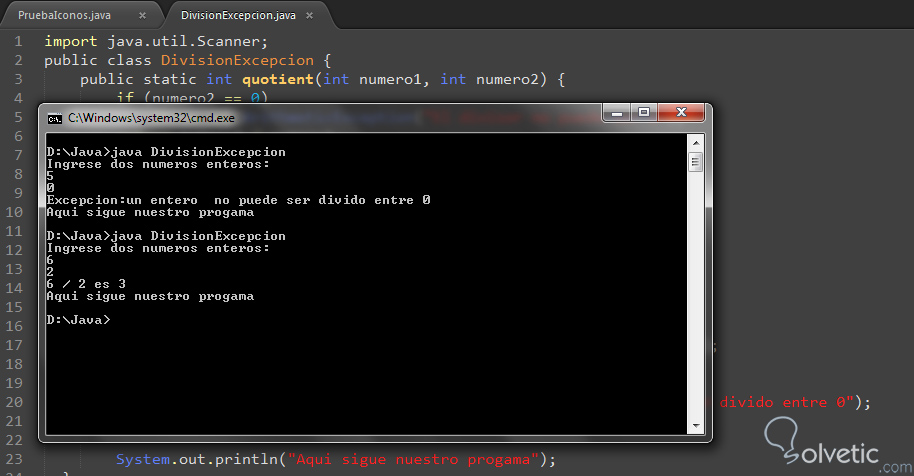 Notamos que la excepción la arrojamos con el método throw dentro de un método personalizado que hace la división de los números enteros, luego este método lo llamamos dentro de nuestro bloque try y finalmente si la excepción ocurre la capturamos y mostramos el error necesario y luego podemos continuar con nuestro programa. Veamos como luce en nuestra consola: