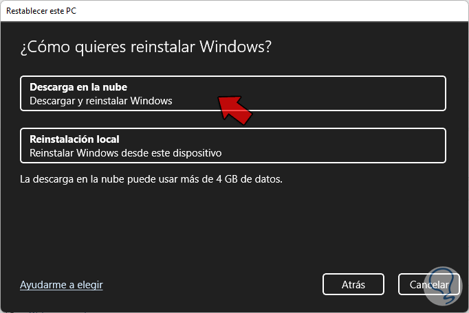 Una vez seleccionado esto debemos seleccionar el tipo de instalación. Allí es posible seleccionar la descarga en la nube la cual descarga la ISO de Windows 11 y automáticamente ejecuta el proceso o bien usar la reinstalación local para la cual debemos contar con la ISO de Windows 11en un DVD o USB de arranque, en este caso seleccionamos la opción “Descarga en la nube”
