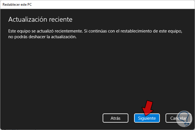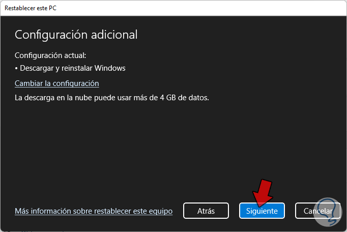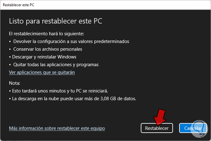 Ahora veremos lo siguiente. Podemos ver en detalle que proceso se llevara a cabo, damos clic en "Restablecer"
