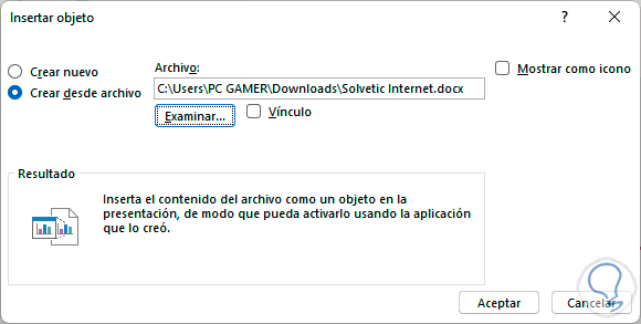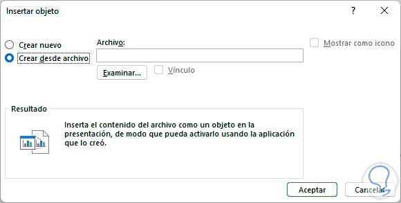 Damos clic en "Objeto" para ver la siguiente ventana emergente en donde activaremos la casilla “Crear desde archivo”: