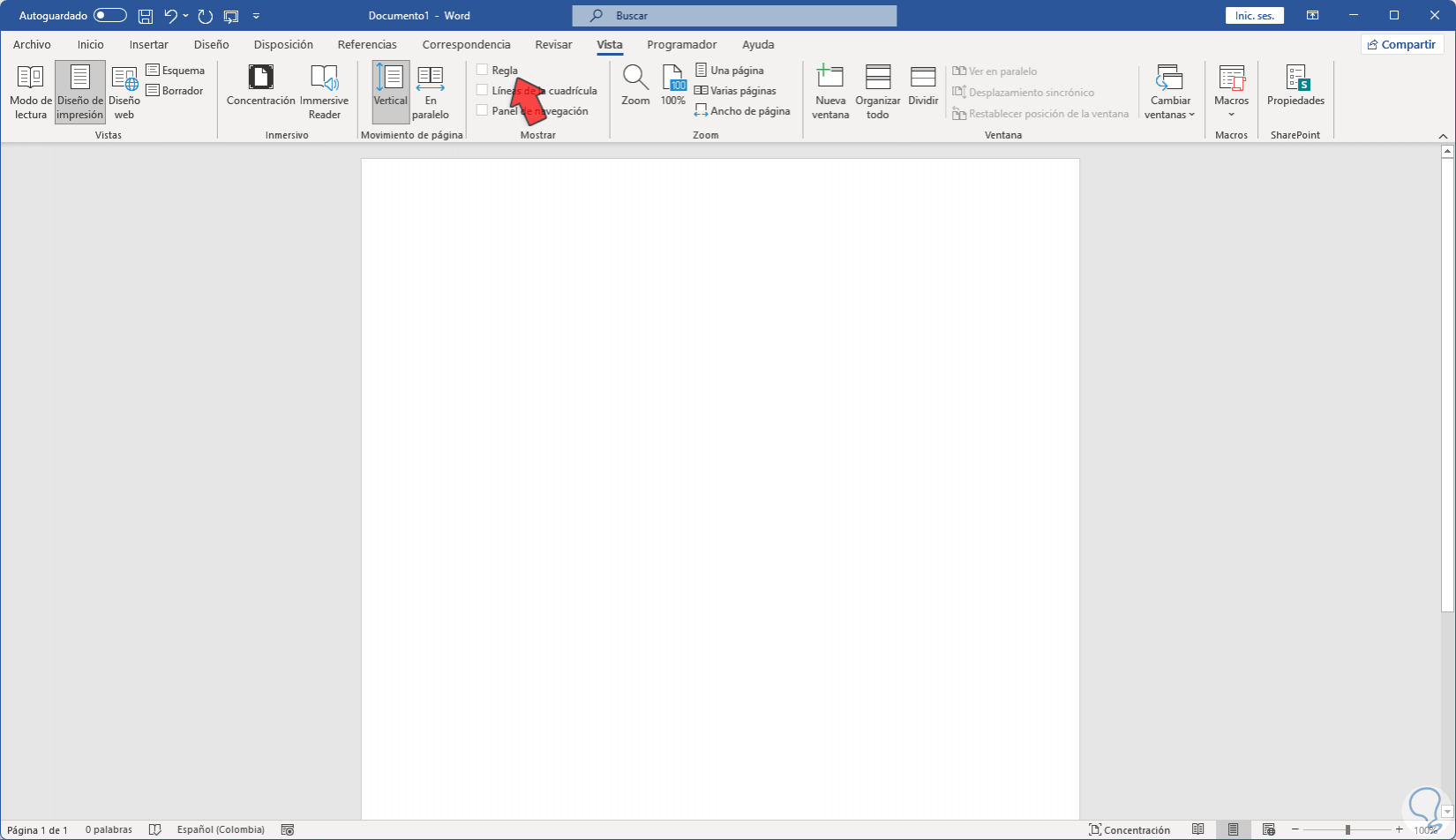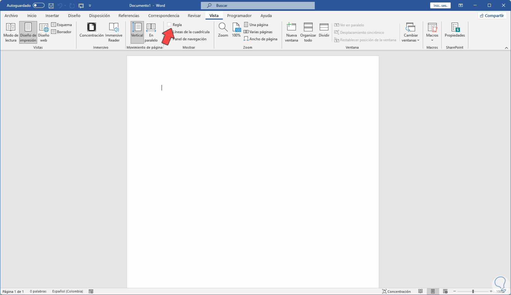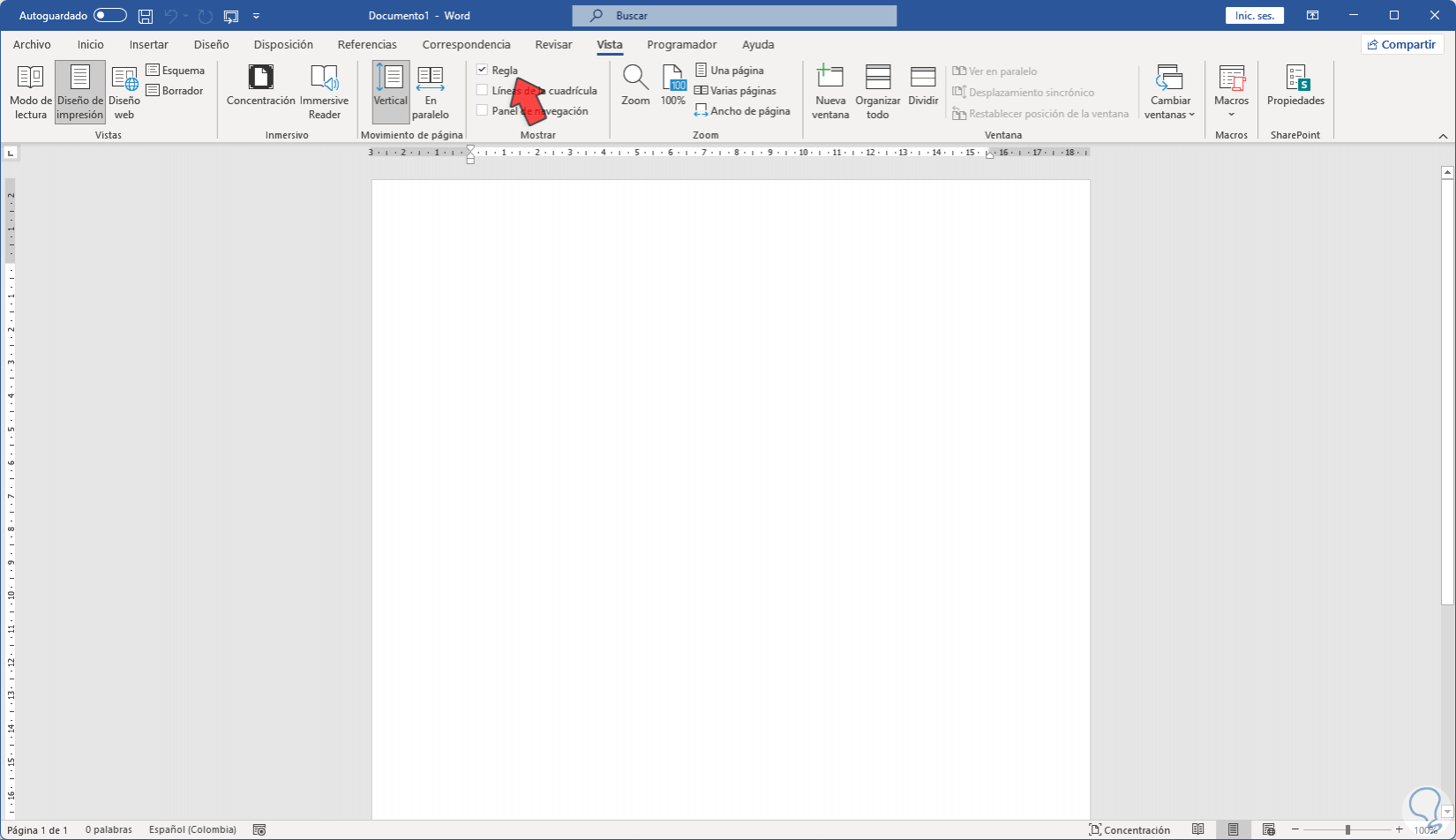 Para ocultar la regla vamos a "Vista" y allí desactivamos la casilla "Regla". Ya no aparecerán los medidores de la regla en nuestro documento.