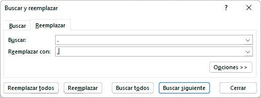 Vamos a la pestaña "Reemplazar", allí en el campo "Buscar" ingresamos el punto "." y en el campo "Reemplazar con" ingresamos la coma ",":