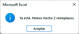 Damos clic en "Reemplazar todos" para que todo el proceso se haga global, veremos la cantidad de cambios realizados: