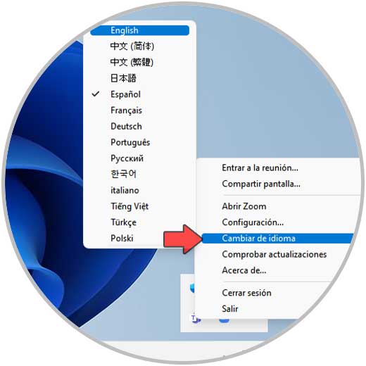 Zoom se reiniciará para estar en ese idioma al momento de dar clic en el idioma:
