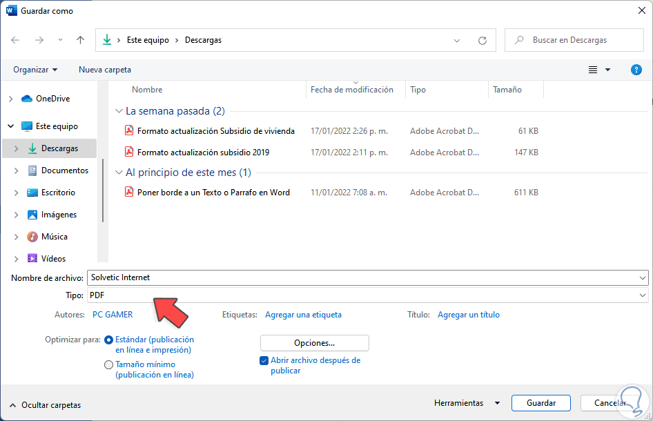 Seleccionamos la ruta donde se guardará y en la ventana emergente en el campo "Tipo" seleccionamos "PDF":
