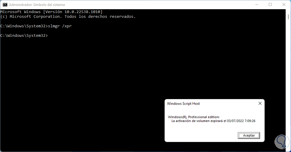 Ejecutamos el comando "slmgr /xpr", esto desplegara una pequeña ventana emergente donde veremos el estado de activación de Windows 11: