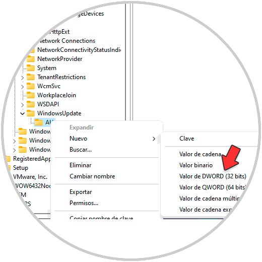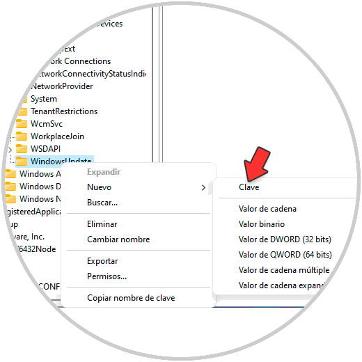 Da clic derecho sobre WindowsUpdate y seleccionamos "Nuevo - Clave":