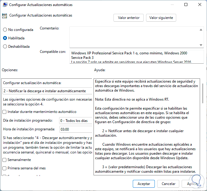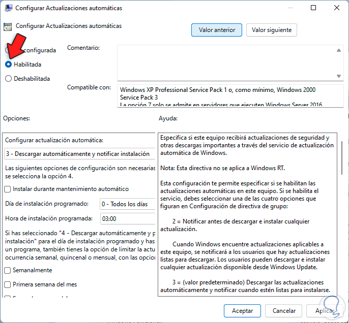 Es posible que llegue el momento en que se necesite activar las actualizaciones pero con el editor de políticas podemos definir la forma como estas se comportan, para ello abrimos la política y activaremos la casilla "Habilitada":