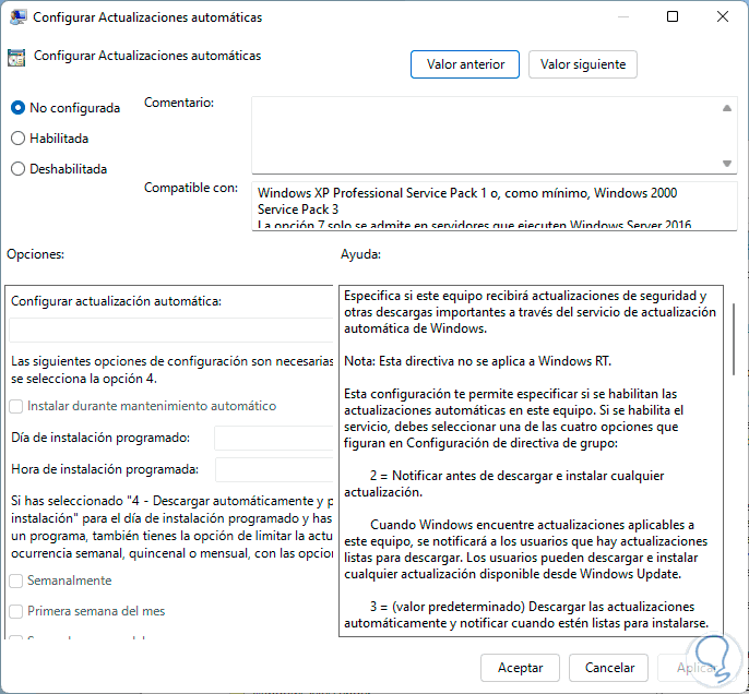 Seleccionamos y abrimos la política "Configurar Actualizaciones automáticas", veremos lo siguiente por defecto: