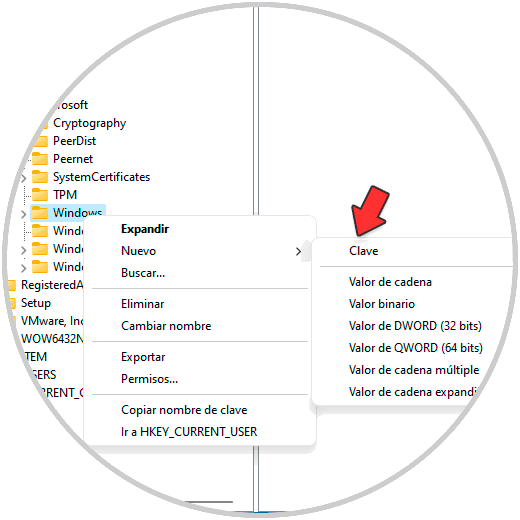 HKEY_LOCAL_MACHINE - SOFTWARE - Policies - Microsoft – WindowsDamos clic derecho sobre Windows y selecciona "Nuevo - Clave":