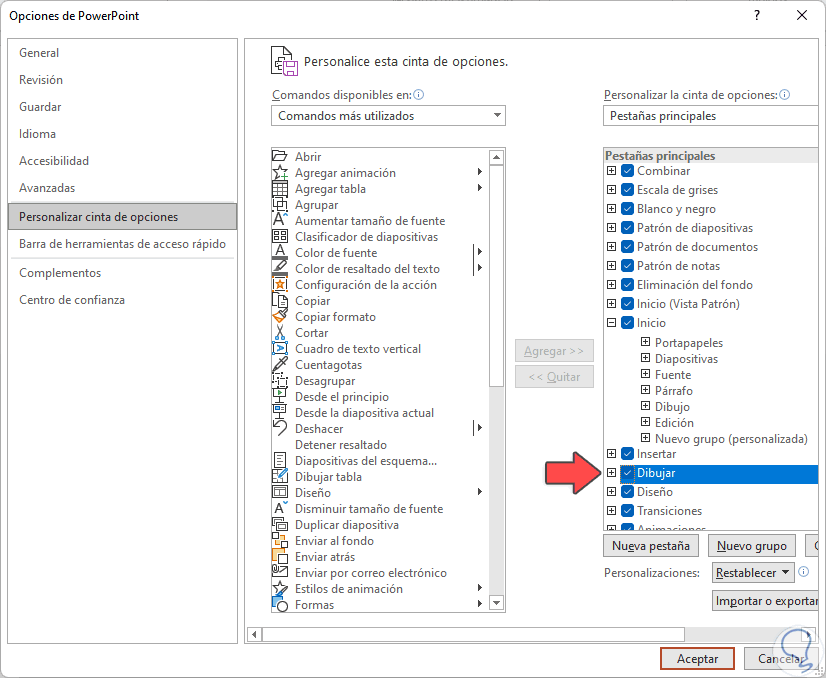 Para ello haremos uso del menú Dibujar, en algunas ocasiones no viene activo por defecto, para su activación, abrimos PowerPoint y vamos a Archivo – Opciones, en la sección “Personalizar cinta de opciones” y debemos activar la casilla “Dibujar”: