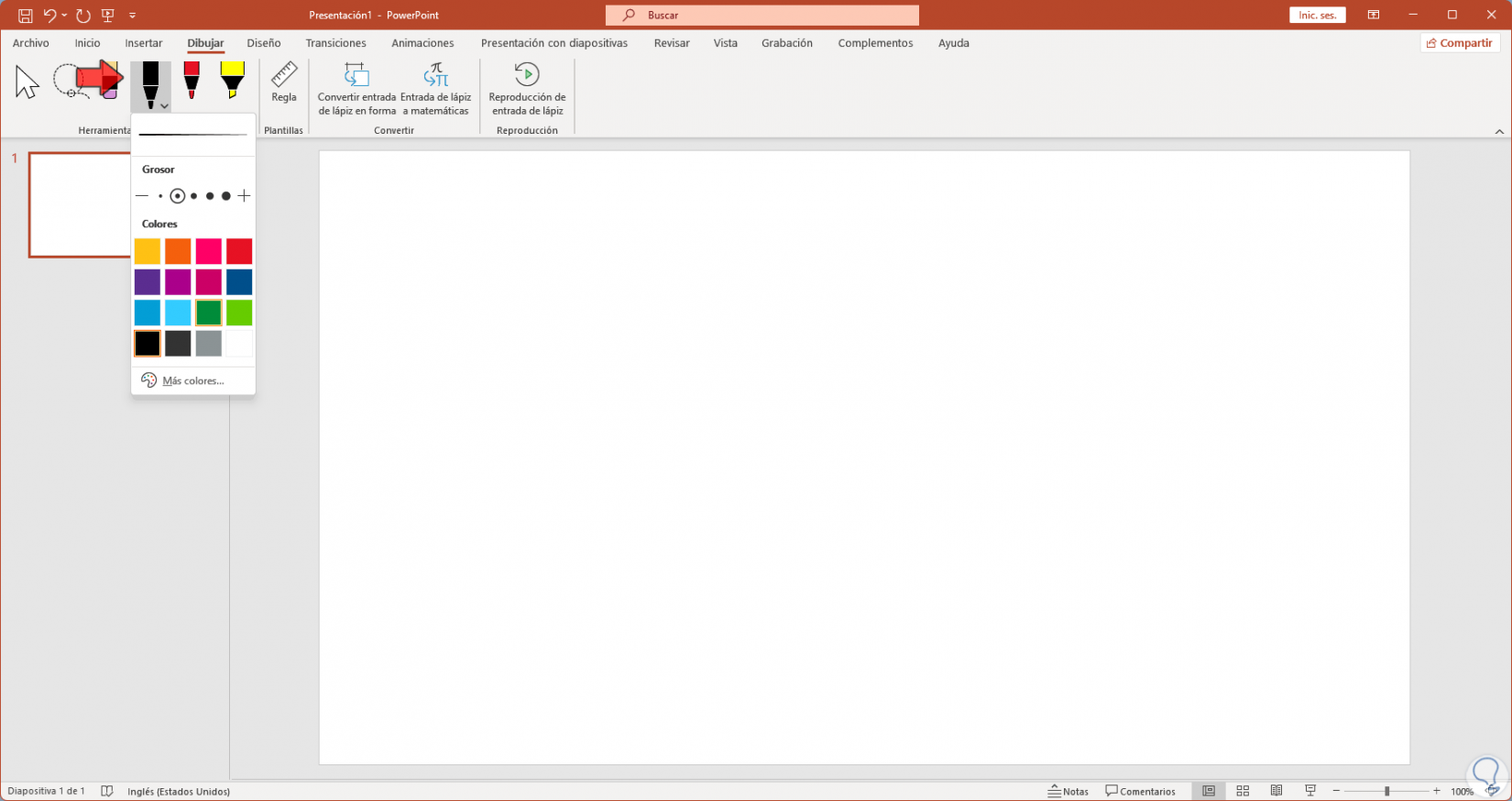 En "Herramientas de dibujo" seleccionamos alguno de los marcadores disponibles (por tamaño) para trabajar en la dispositiva, al seleccionar un marcados damos clic sobre el para elegir el color y el tamaño del trazado: