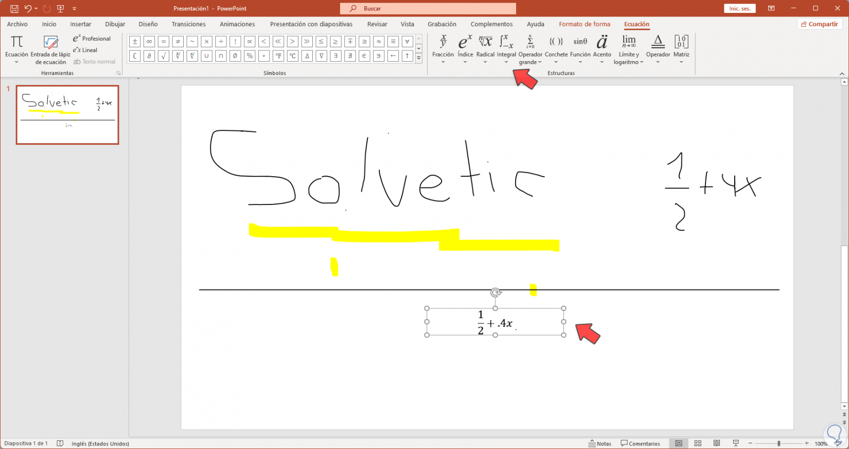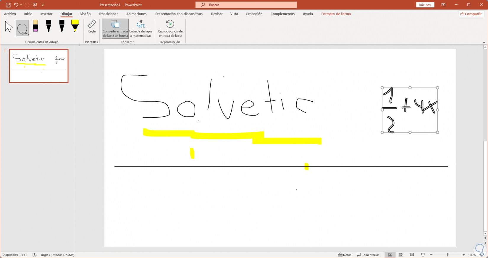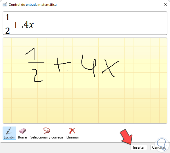 Pero el menú Dibujar nos ofrece una forma mucho más completa para ello, podemos seleccionar la formal o bien dar clic en "Entrada de lápiz a matemáticas":