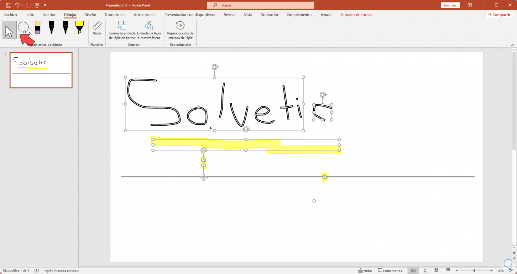 Para seleccionar solo un elemento o una parte, damos clic en el icono de forma libre y seleccionamos lo deseado en la diapositiva: