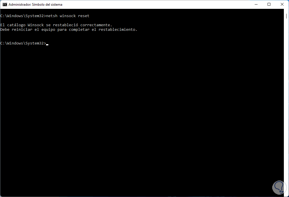 Ahora vamos a ejecutar el siguiente comando para restablecer Winsock el cual es la interfaz que se encarga de gestionar las solicitudes de entrada/salida de las aplicaciones de Internet, usaremos la siguiente línea: