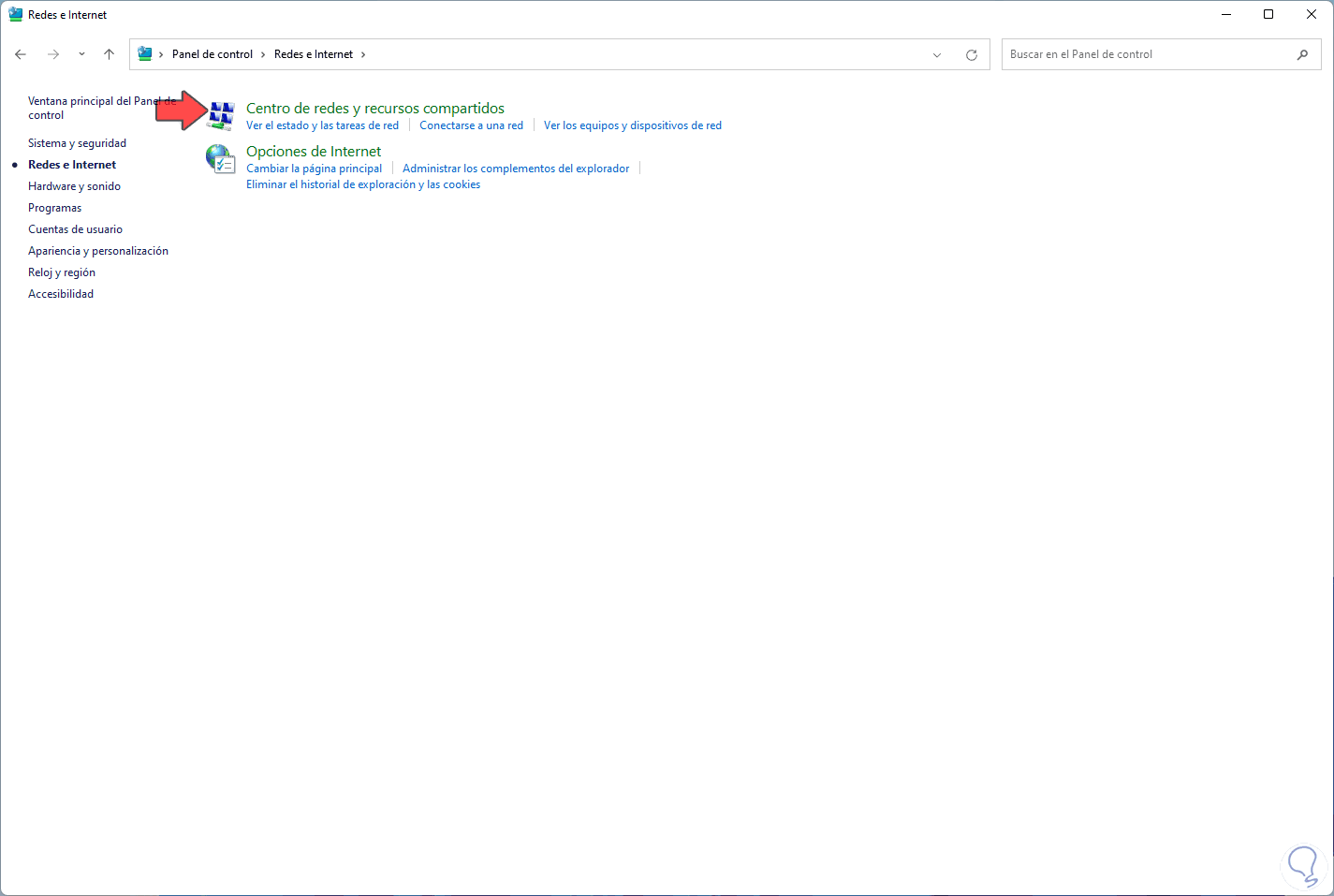 Veremos lo siguiente. Damos clic en “Redes e Internet”