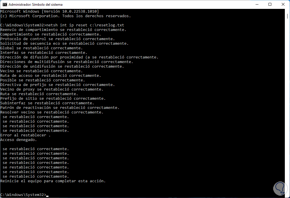 Este comando netsh permite hacer uso de una secuencia de comandos para modificar la configuración de red del PC y en este caso se han restablecido los parámetros generales del adaptador de red en Windows 11 (tanto Wi-Fi como Ethernet).