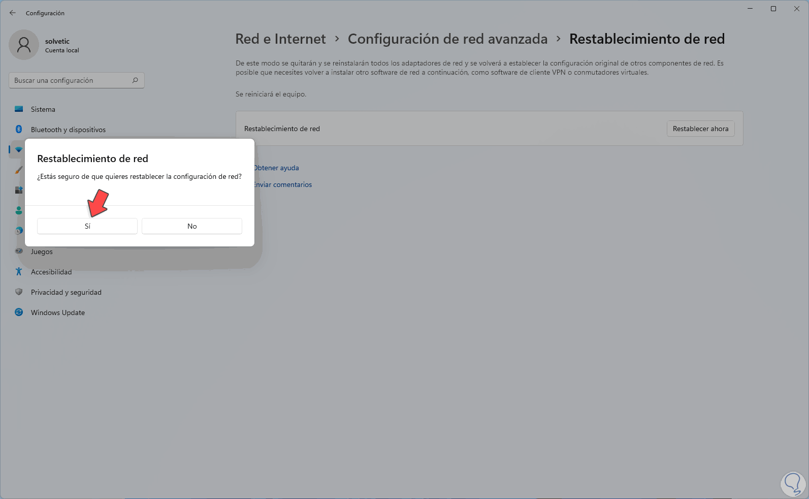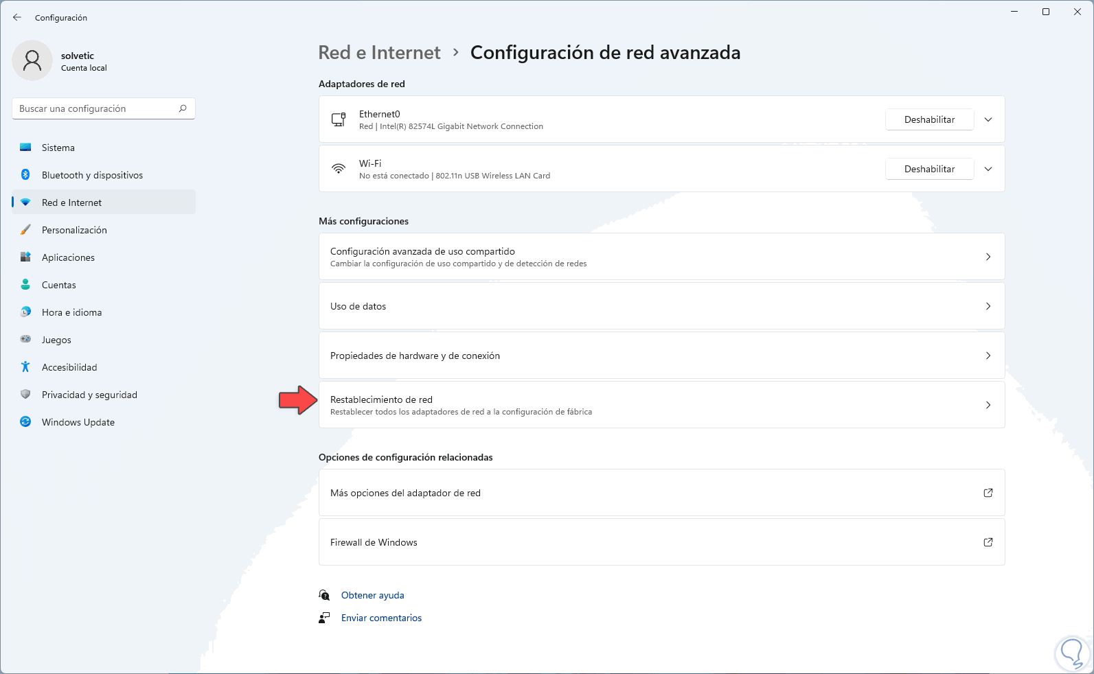 Allí damos clic en clic en "Restablecimiento de red" para ver la siguiente ventana: