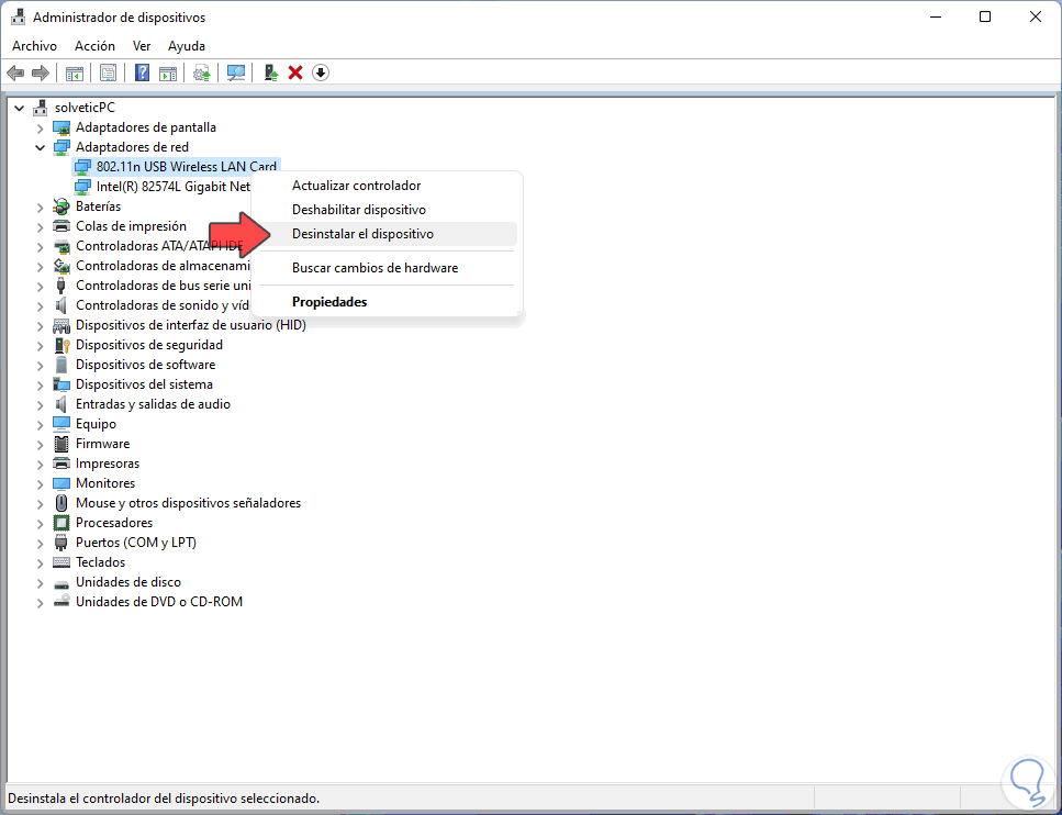 En "Adaptadores de red" damos clic derecho sobre el adaptador WiFi y luego seleccionamos la opción "Desinstalar el dispositivo":