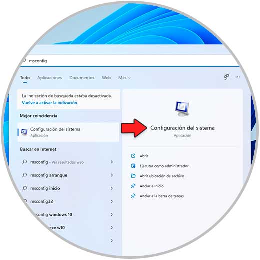 La configuración del sistema nos da la oportunidad de realizar innumerables gestiones sobre el sistema y sus componentes, para acceder a ella en el buscador de Inicio ingresamos "msconfig":