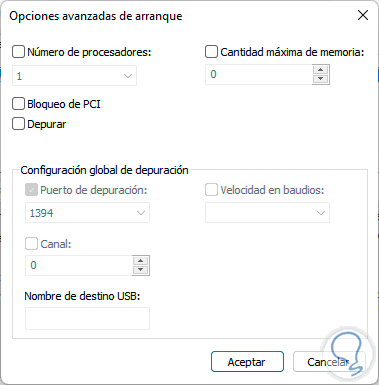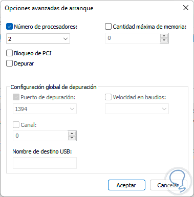 Activamos la casilla "Número de procesadores" y seleccionamos la cantidad de procesadores a usar: