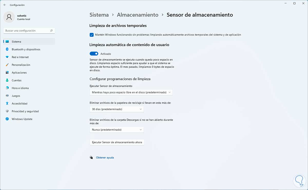 El Sensor de almacenamiento es el mecanismo integrado en Windows 11 para gestionar el almacenamiento de forma automática, damos clic allí para ver esto: