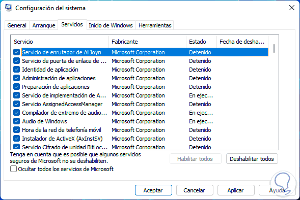 Pulsamos en la columna "Fabricante" para ordenarlos de esta manera y desactivamos los servicios no necesarios: