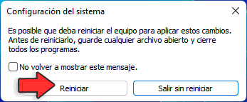 De vuelta en Configuración del sistema aplicamos los cambios y reiniciamos Windows 11 dando clic en Reiniciar: