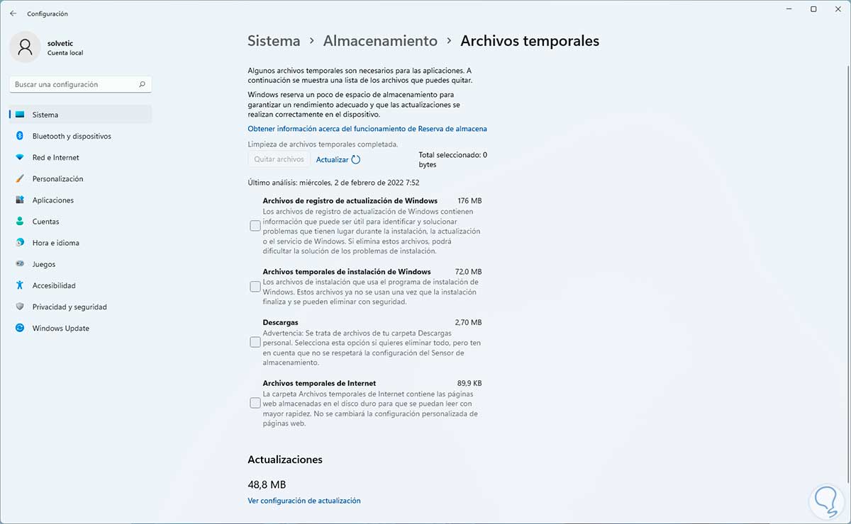 Damos clic en "Archivos temporales" y veremos lo siguiente: